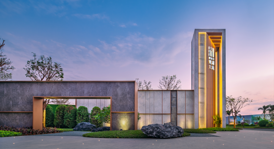 金屬流線勾勒剛勁石材,鐵瀑沿墻潺潺而落,是入口處的點(diǎn)睛之筆。夜晚燈光點(diǎn)亮,它便是歸家之路的指明燈,一眼望去自然安定。