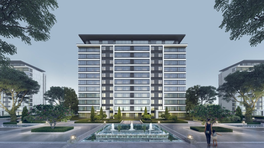 極簡主義的鏡面水景,倒映出“杭派精工”引以為傲的超大窗墻比建筑。