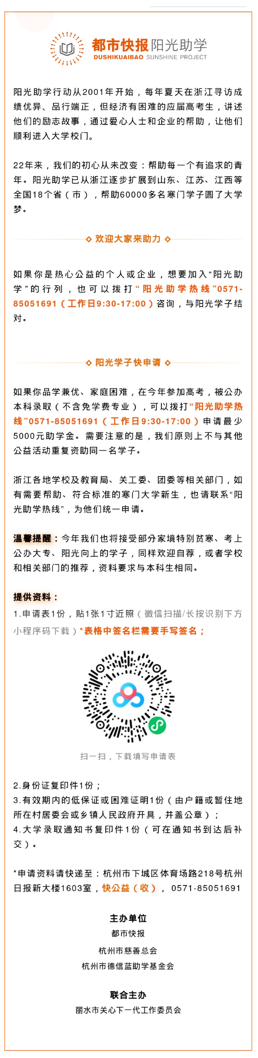 如果你也想幫助陽光學(xué)子圓大學(xué)夢,或者你身邊有希望圓夢的寒門學(xué)子,都可以撥打都市快報“陽光助學(xué)熱線”0571-85051691(工作日9:30-17:00)咨詢,謝謝你們對陽光學(xué)子的支持和鼓勵。你也可以關(guān)注快公益微博、微信,獲取更多助學(xué)信息。